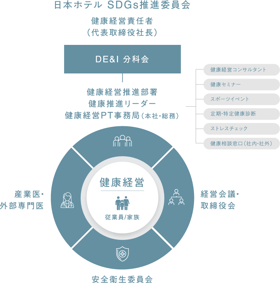 代表取締役社長を健康経営責任者とし、各箇所の責任者・健康推進リーダー・健康経営